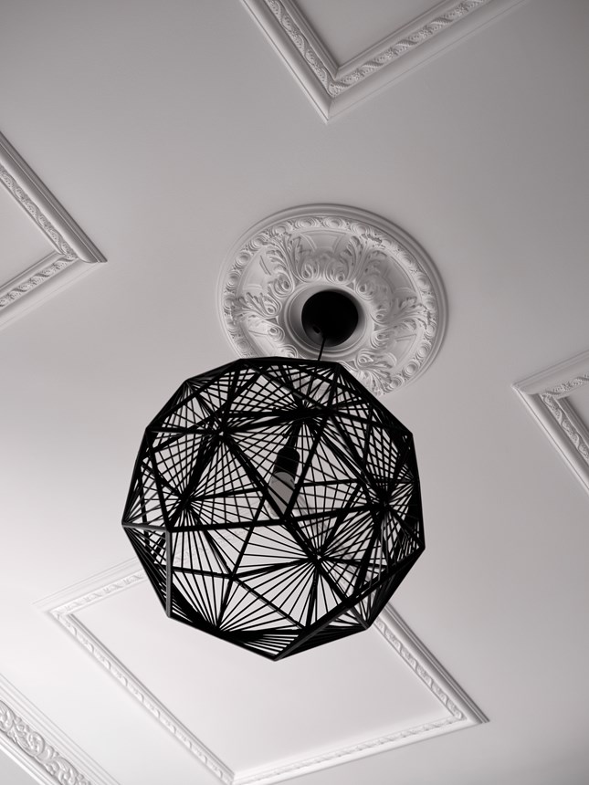 L'installazione di R8 come base per l'illuminazione è facile da realizzare semplicemente forando il cerchio piano centrale. Il rosone R8 ARSTYL® è fornito già primerizzato e pronto per la verniciatura nel colore finale. Fissare R8 in posizione con la colla ADEFIX®.
