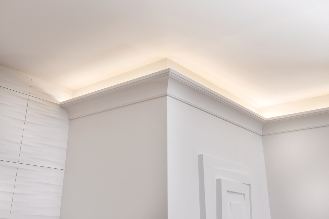 Gzymsy, listwy i dekoracje ścienne można łączyć z oświetleniem bezpośrednim lub pośrednim. Zaprojektowane dla przytulnej